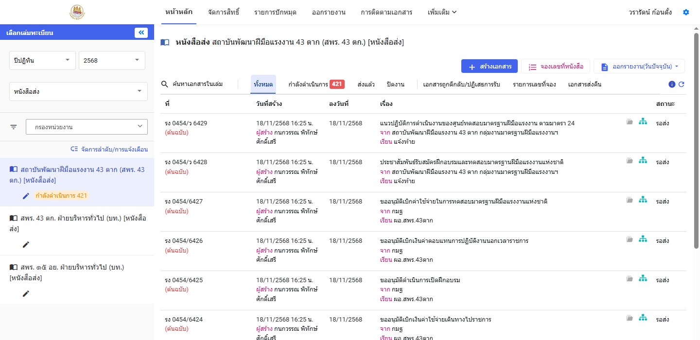 | 5272 | ระบบสารบรรณอิเล็กทรอนิกส์ | กนกวรรณ พิทักษ์ศักดิ์เสรี | ตาก | ปุ่ม ใช้เลขจอง หน้า สถาบันพัฒนาฝีมือแรงงาน 43 ตาก (สพร. 43 ตก.) [หนังสือส่ง] ของ นางสาววรารัตน์ ก้อนตั้ง ไม่ขึ้นค่ะ ตอนจองเลขหนังสือส่ง ใช้ชื่อ นางสาวกนกวรรณ พิทักษ์ศักดิ์เสรี จอง และกดอนุญาตให้ใช้เลขจองได้ แล้วค่ะ ตอนแรกที่เคยสอบถามเข้ามา ลองติ๊กอนุญาตให้ใช้เลขจอง ก็ขึ้นแล้วค่ะ แต่ตอนนี้ไม่ขึ้นอีกแล้วค่ะ ไม่ทราบว่าเป็นเพราะอะไรคะ