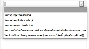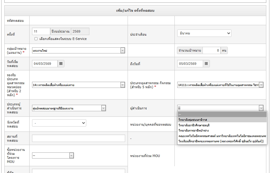 | 5490 | ระบบรายงานผลการพัฒนาฝีมือแรงงาน | นายสุรศักดิ์ ลาลิตร | อุตรดิตถ์ | ระบบรายงานผลการพัฒนาฝีมือแรงงาน ในส่วนของการเปิดการทดสอบมาตราฐานฝีมือแรงงาน เมื่อเลือกประเภทผู้ดำเนินการทดสอบเป็นศูนย์ทดสอบมาตรฐานฝีมือแรงงาน แล้วเลือกผู้ดำเนินการ ตัวเลือกขึ้นเพียง 5 ตัวเลือก และไม่มีผู้ดำเนินการภายในพื้นที่