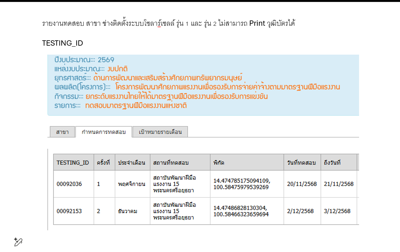 | 5321 | ระบบรายงานผลการพัฒนาฝีมือแรงงาน | จันทนา สุฉันทบุตร | พระนครศรีอยุธยา | ไม่สามารถ Print หนังสือรับรองผู้ผ่านการทดสอบมาตรฐาน (แบบ มฐ.6) ในระบบได้คะ TESTING_ID 00092036, 00092153