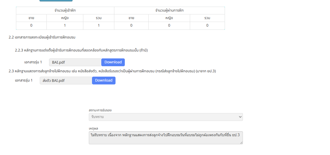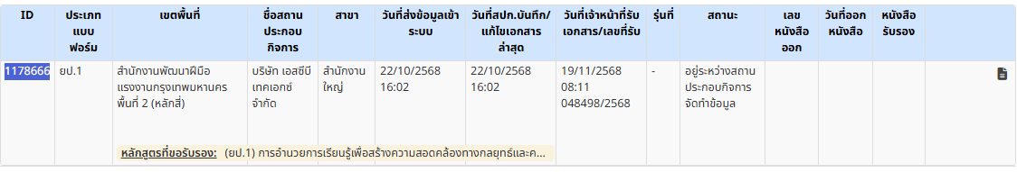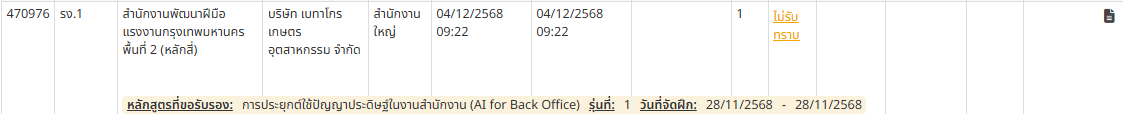 | 5324 | ระบบรายงานผลการพัฒนาฝีมือแรงงาน | วศิน ศรีวิเชียร | กรุงเทพมหานคร | ขอแจ้งแก้ไข ข้อมูลรุ่นของ ID 1039803 ระบบเก่าก่อนวันที่ 19 สิงหาคม 68 เนื่องจาก ลืมใส่จำนวนผู้เข้าฝึกอบรมทั้งหมด (ตามรูปแนบครับ) บริษัทปริ้นหนังสือรับรองแล้วไม่มีค่าใช้จ่ายระบุไว้ในหนังสือรับรองครับ