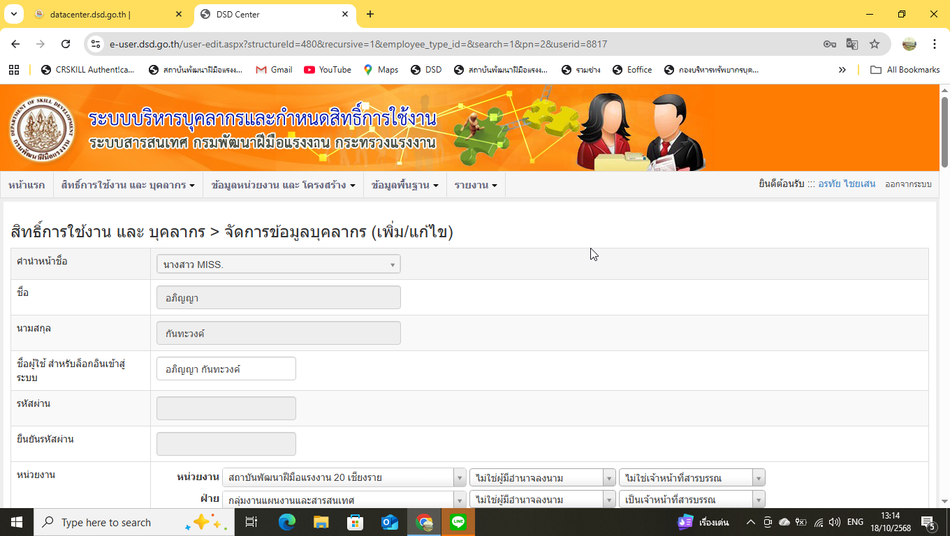 สถาบันพัฒนาฝีมือแรงงาน 29 ฉะเชิงเทรา ขอเพิ่มชื่อบุคลากรในระบบทะเบียนทรัพย์สินและครุภัณฑ์