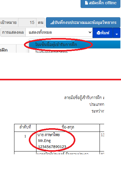 ข้อแนะนำ:สพร. 3 ชลบุรี ขอความอนุเคราะห์เพิ่มข้อมูลชื่อภาษาอังกฤษและเลขประจำตัวประชาชน 13 หลักของผู้สมัคร ในใบเซ็นชื่อผู้เข้ารับการฝึกอบรม เพื่อให้ผู้รับการฝึกตรวจสอบความถูกต้องก่อนเริ่มการฝึก