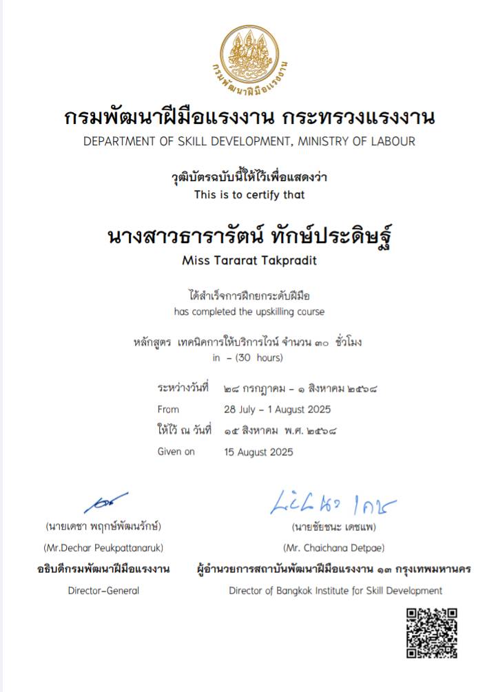 ในวุฒิบัตรไม่มีชื่อภาษาอังกฤษ ของหลักสูตร// หลักสูตรเทคนิคการให้บริการไวน์ รหัสหลักสูตร 812001732317 โดยสพร. 13 กทม. เอาเข้าโครงการพัฒนาทักษะแรงงานรองรับนโยบาย Soft Power อบรมระหว่างวันที่ 28 ก.ค. - 1 ส.ค. 68 2568